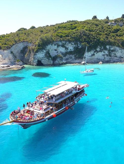 Το ταξίδι μας λοιπόν, ξεκινά στις 10 το πρωί και κατευθύνεται δυτικά. Μετά από μια ώρα που φτάνουμε στους Αντίπαξους και σταματάμε ανοιχτά της παραλίας, αρόδου, όπου έχετε τη δυνατότητα, χρησιμοποιώντας τις σκάλες του καραβιού, να κολυμπήσετε για 40- 45 λεπτά, σε ένα μαγευτικό φυσικό κόλπο δίπλα στα πολυτελή γιοτ του διεθνούς jet set στα απίστευτα καθαρά γαλαζοπράσινα νερά, που είναι μοναδικά στη Μεσόγειο.