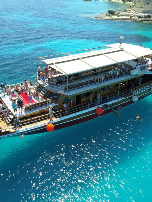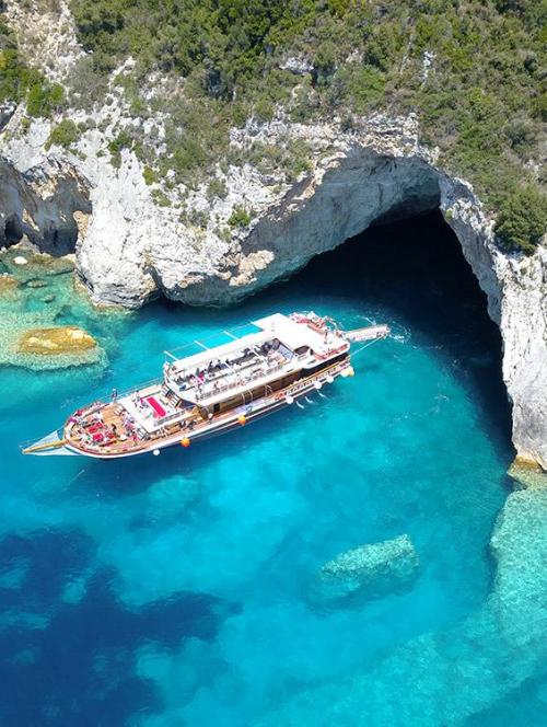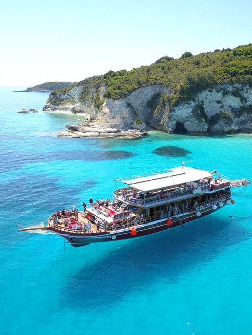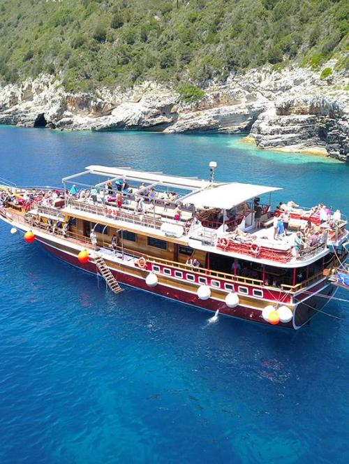 ΤHE BOAT DOES NOT APPROACH THE SHORE WHEN VISIT ANTIPAXOS AND THE CAVES. IT STOPS IN THE OPEN SEA AND SWIMMING IS OPTIONA. DIVING FROM THE UPPER DECK OR THE SIDE OF THE SHIP IS NOT ALLOWED. ACCESS TO THE SEA IS ONLY BY THE STAIRS PROVIDED ON THE LOWER DECK AND IT IS NOT ALLOWED TO LEAVE THE SURROUNDING AREA OF THE SHIP. THE AVAILABLE TIME AND INSTRUCTIONS WILL BE ANNOUNCED OVER THE BOAT'S MICROPHONE. AFTER THE SOUND SIGNAL FROM THE SHIP'S HORNS, ALL BATHERS MUST RETURN ON TIME FOR DEPARTURE. IF ANCHORING AT THE PRE-DESIGNATED POINT IS NOT POSSIBLE (WEATHER CONDITIONS, PRESENCE OF JELLYFISH, LACK OF SUITABLE SPACE, ETC.) FOR THE SAFETY OF THE PASSENGERS, THE CAPTAIN WILL SKIP THE STOP OR CHOOSE A DIFFERENT DESTINATION.